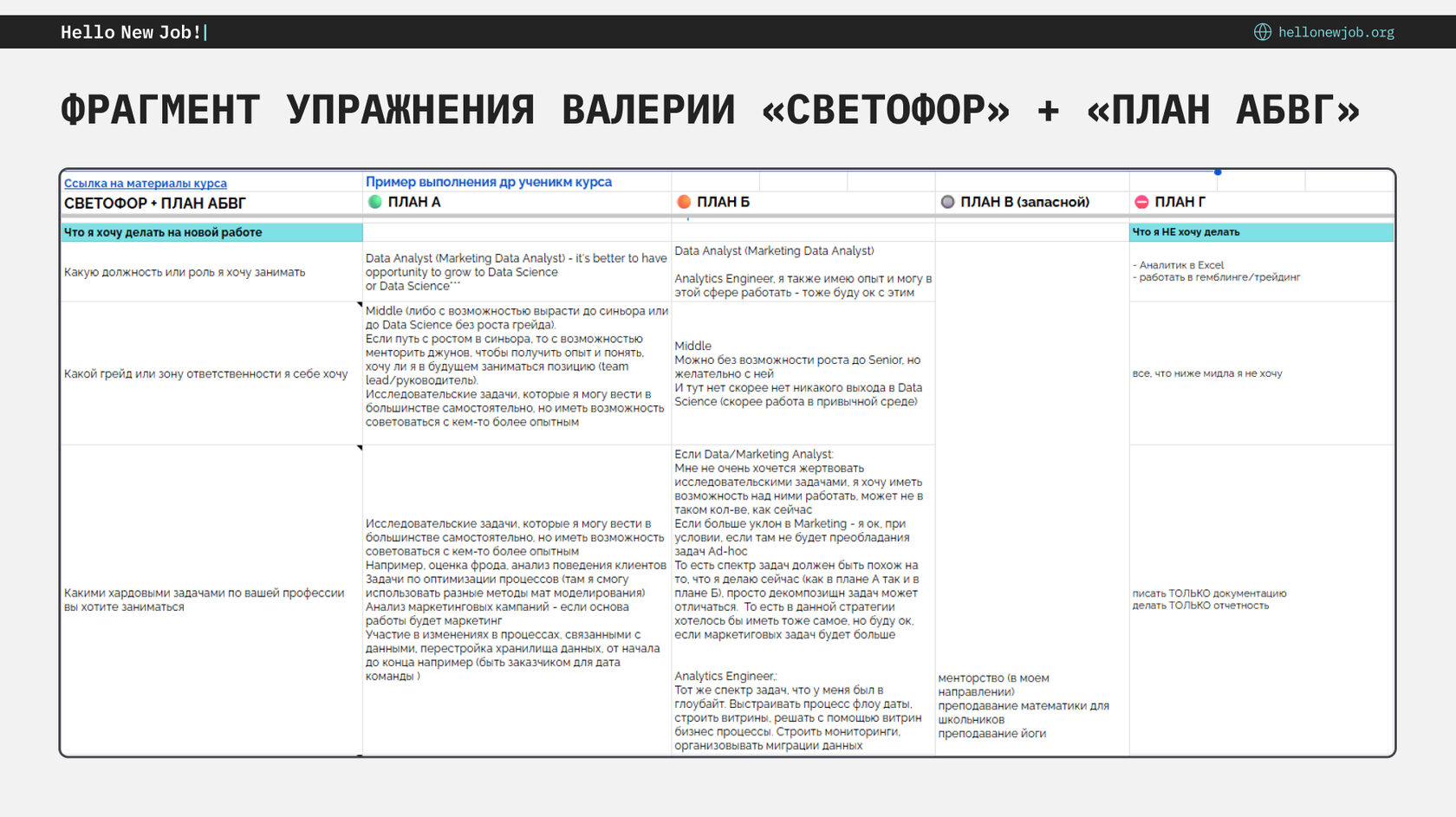 Одно из первых упражнений курса — «План АБВГ». Благодаря ему я сформулировала конкретные требования к новой работе и выделила приоритеты при поиске.