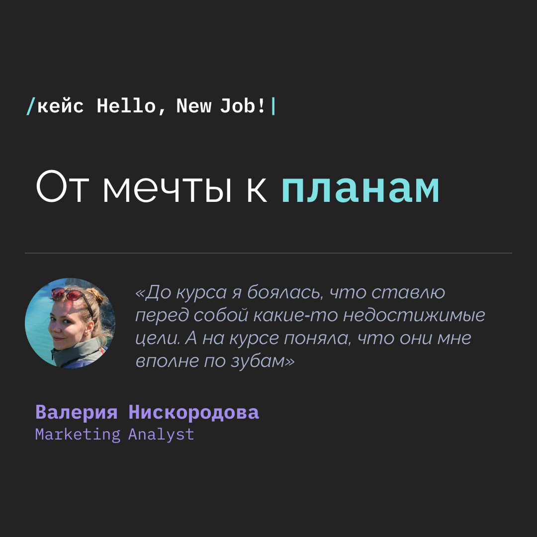 Курс помог мне посмотреть на поиск работы как на возможность протестить разные гипотезы. Кира часто говорит, что менять стратегию — это ок. Понять, что какой-то план для тебя сейчас не работает, и согласиться на вариант Б или даже В — это совершенно нормально. Это осознание очень помогает психологически.