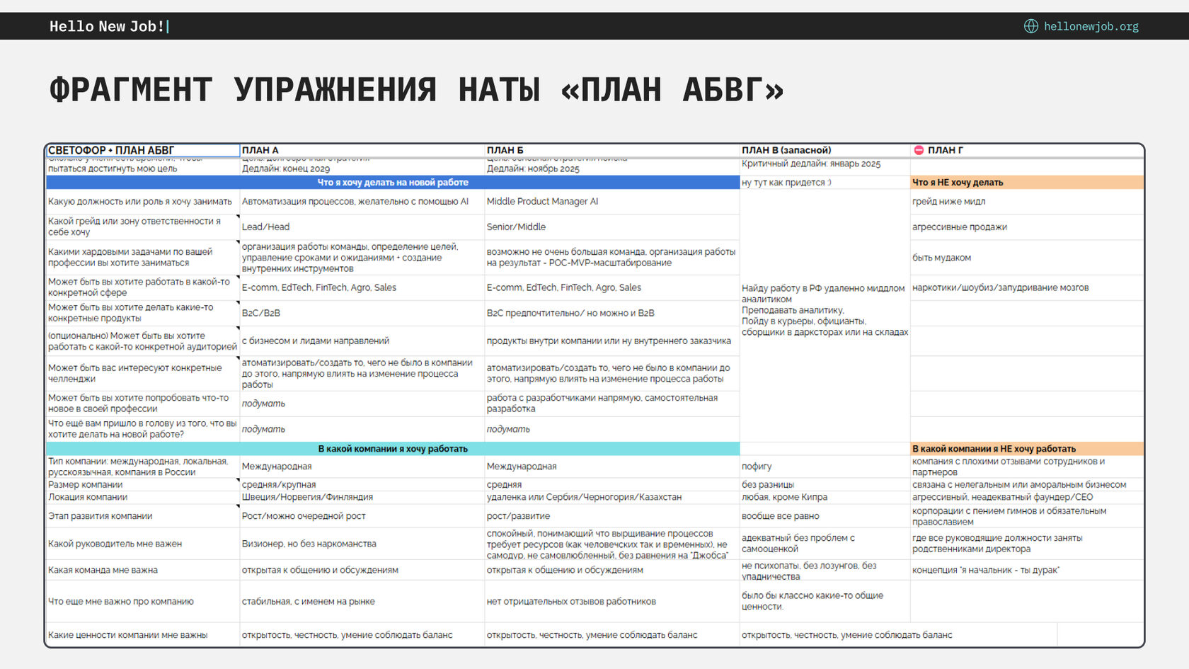 План АБВГ — одно из первых упражнений курса Hello New Job! Студенты составляют список своих пожеланий и требований к работе мечты и на его основе выстраивают 4 карьерных плана:
