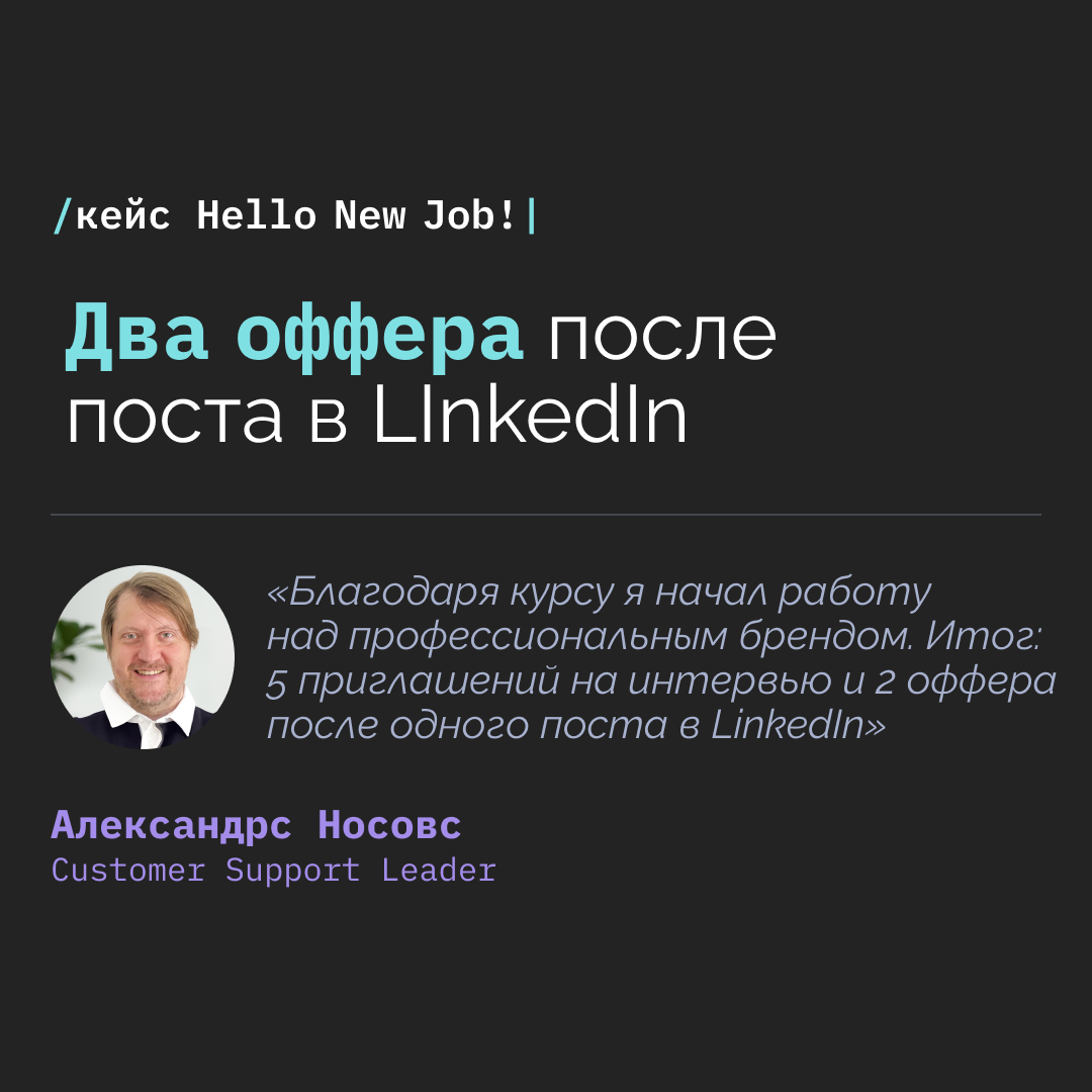 Это рассказ выпускника Hello New Job! Алекса Носовса (вот его LinkedIn), который оказался в ситуации поиска работы впервые за 15 лет. Благодаря курсу он научился использовать LinkedIn на все 100%, системно подошёл к развитию собственного профессионального бренда и получил оффер мечты благодаря одному посту и изобретательной кампании по его продвижению.